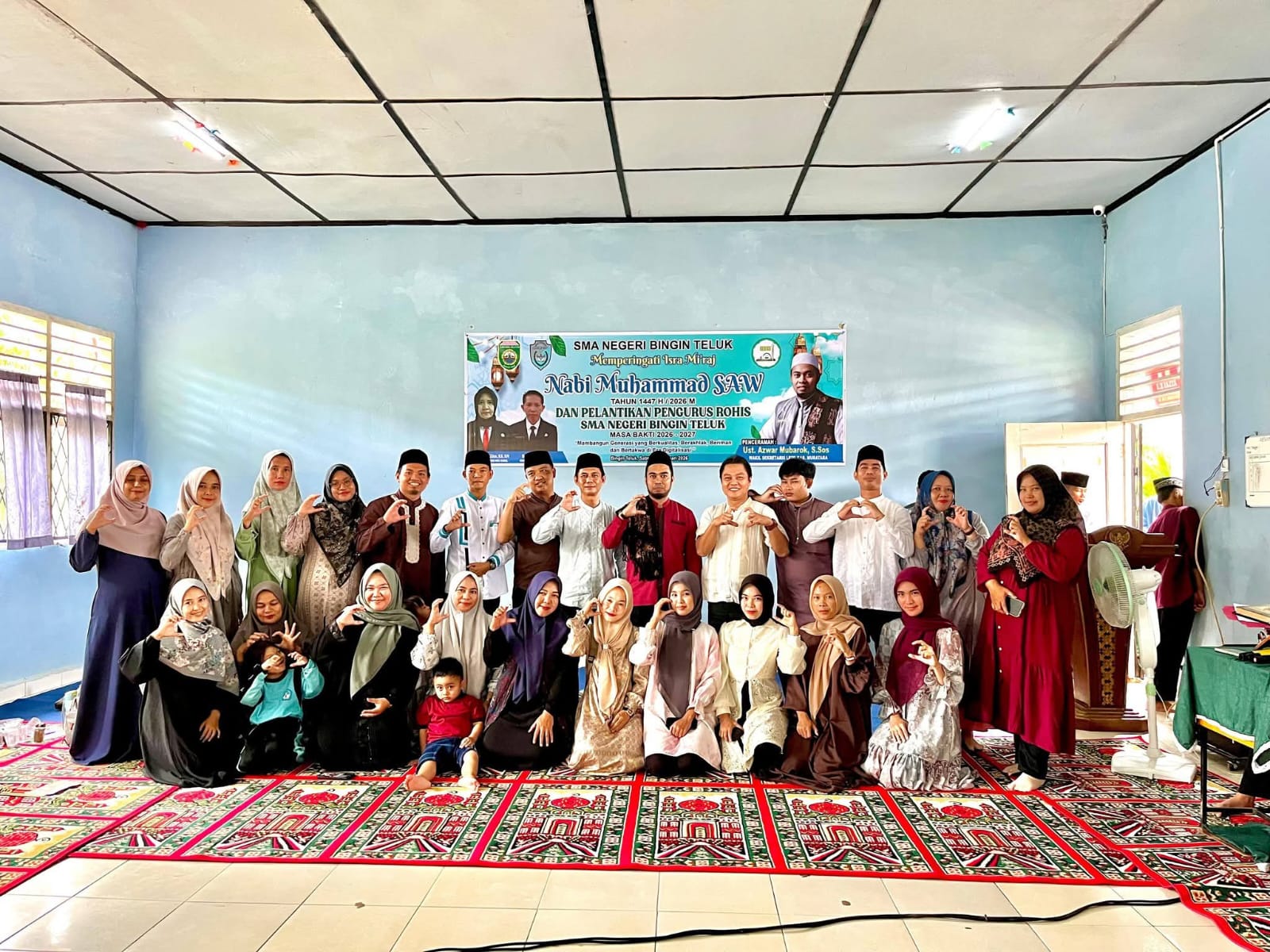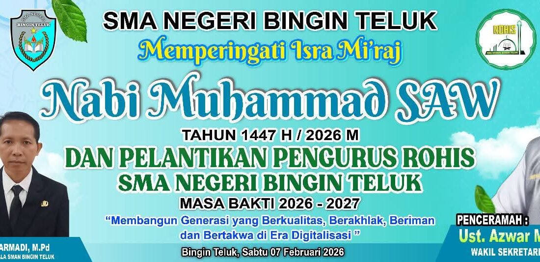 Bingin Teluk, 10 Februari 2026 – SMA Negeri Bingin Teluk menggelar kegiatan Isra Mi’raj sekaligus pelantikan pengurus ROHIS masa bakti 2026/2027 dengan penuh khidmat pada Sabtu, 7 Februari 2026, di Aula sekolah. Acara yang berlangsung lancar ini dimulai pukul 08.00 WIB hingga selesai, dihadiri seluruh warga sekolah yang antusias.